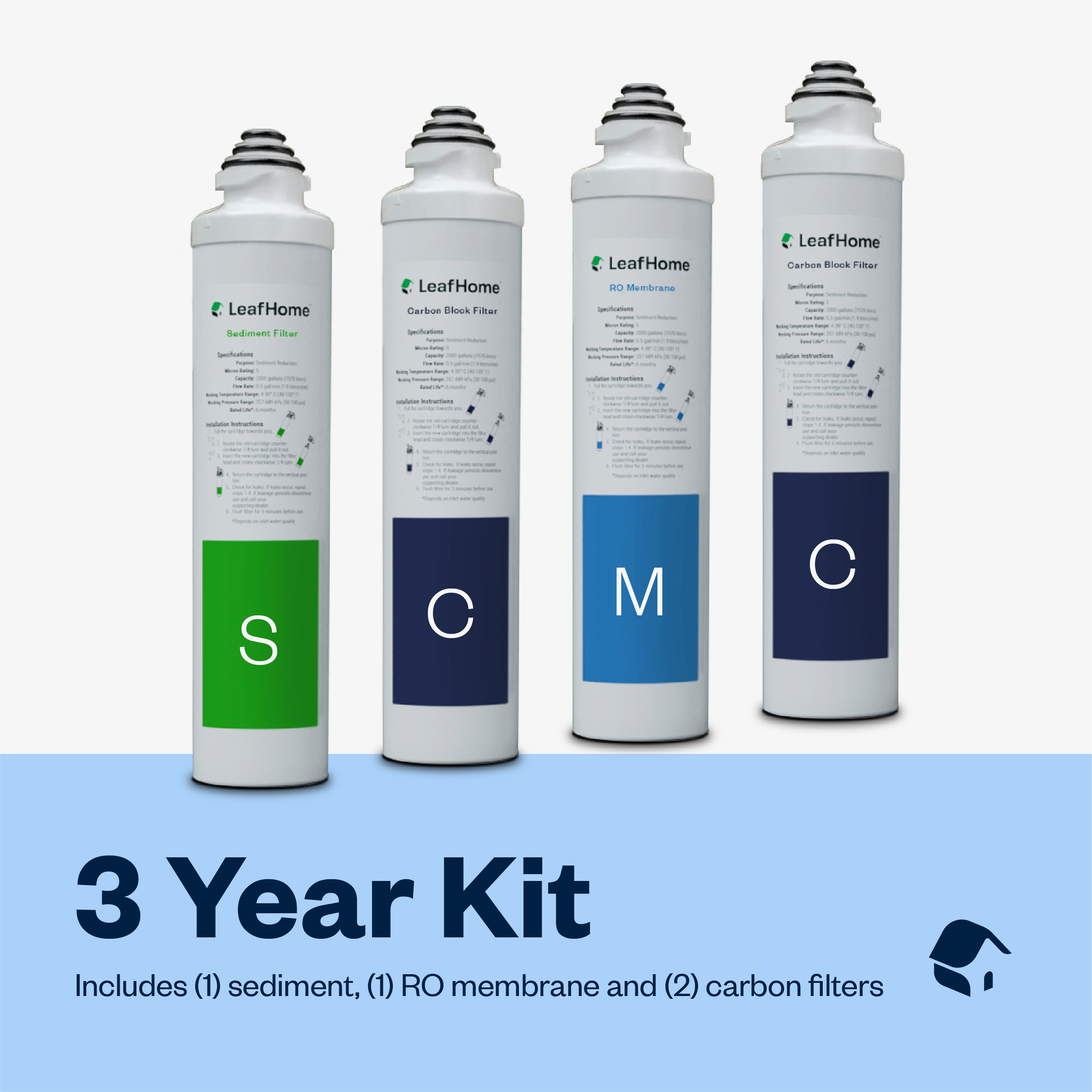The official LeafHome Water Solutions reverse osmosis filter replacement kit for systems that contain sediment, carbon and RO membrane filters.